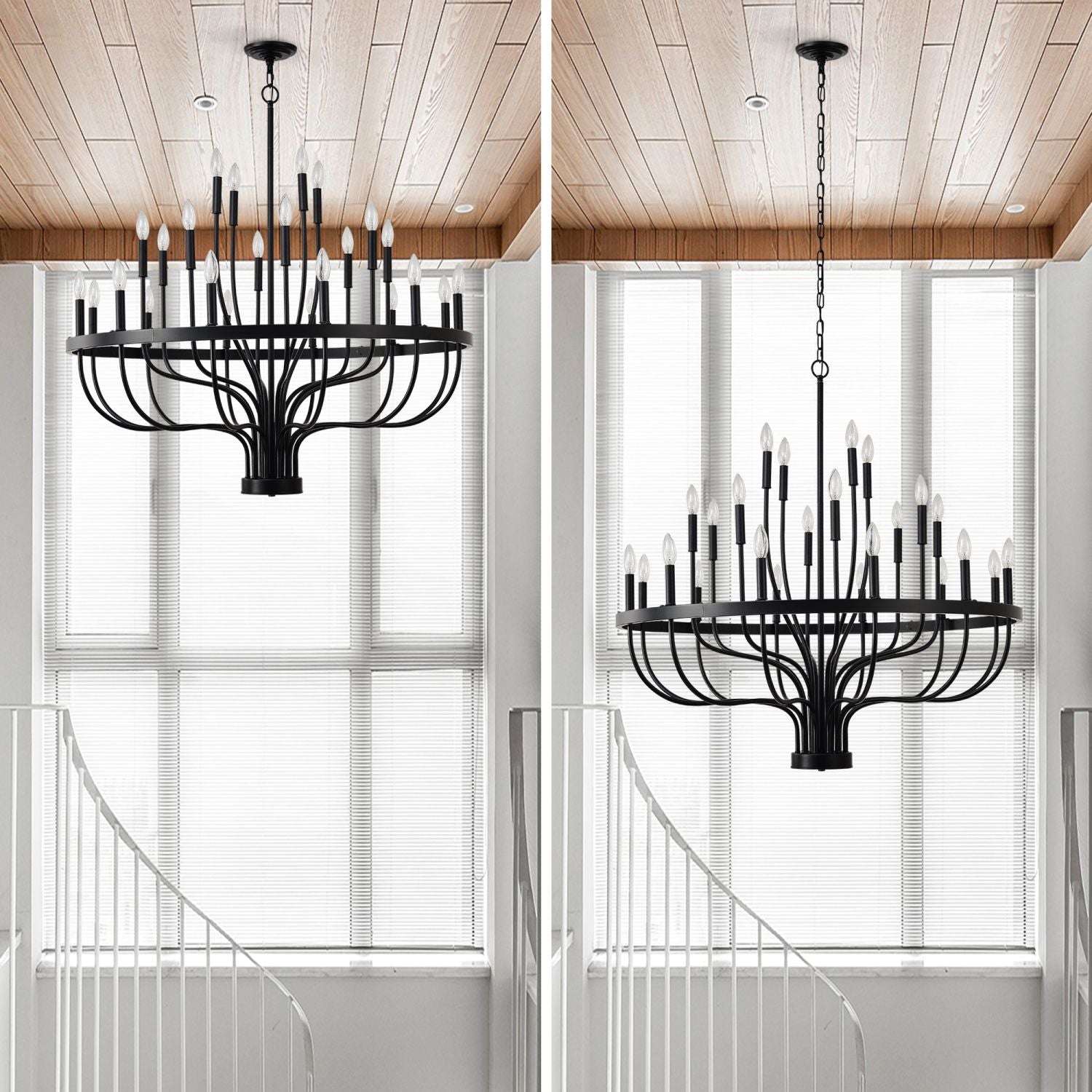 Adjustable Height -- The farmhouse chandelier comes with 3PCS hanging rods ( 1PC*11.81INCH, 1PC*7.87INCH, 1PC*3.93INCH,) + 3PCS Chain(1PC*11.81INCH, 1 PC*19.68INCH, 1PC*39.37INCH) . Maximum height of chandelier 110.26 inch.