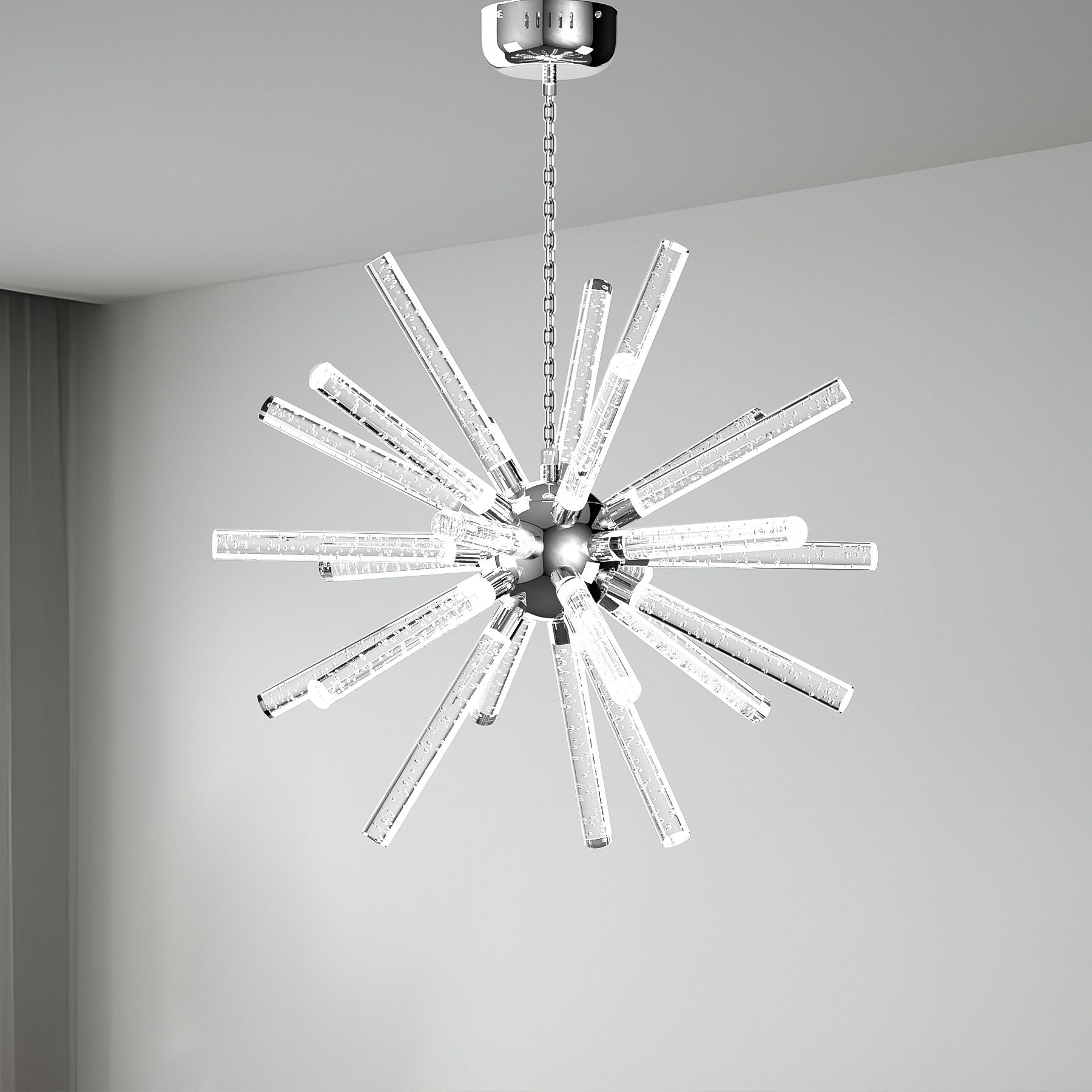 A splendid and luxurious modern satellite-style chandelier is ready to reveal itself before your very eyes. The exquisite reflection of light through 24 transparent acrylic bubble columns illuminates the space, creating a stunning and dazzling effect that takes your breath away.