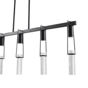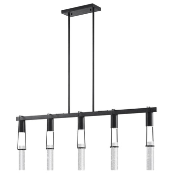 The 5 Light Harmony Chandelier in Matte Black is a 5 light crystal encased in a matte black sculpture that hangs from the ceiling with a cable length of up to 11 feet. The 5 crystals hang from a down rod that measures 45" in length.