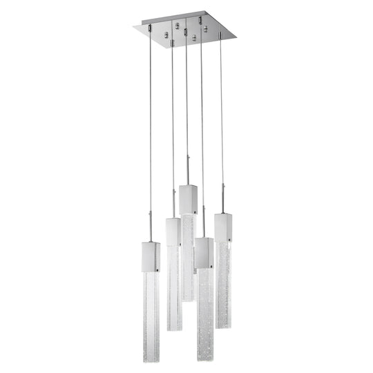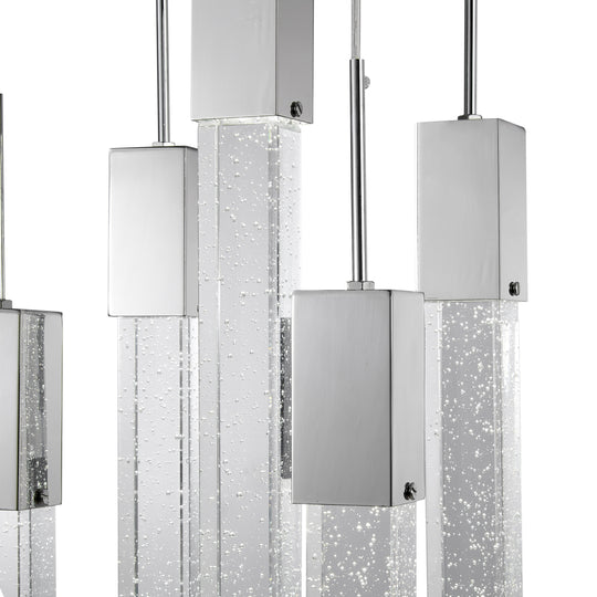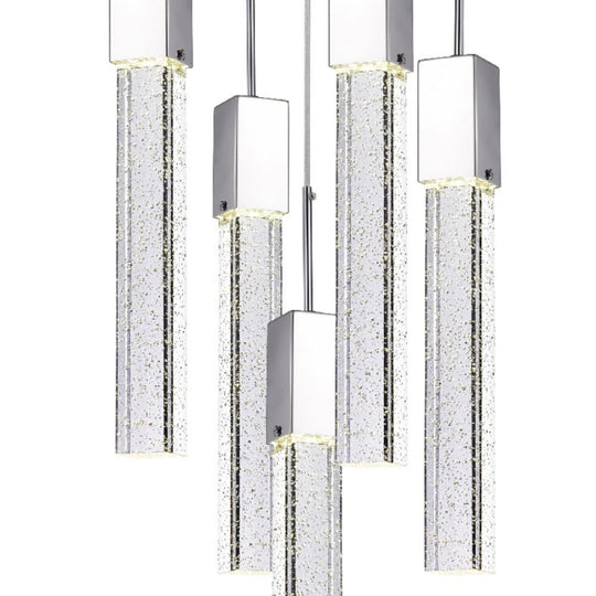 This Five light Sparkling Night Chandelier has a superior design that is very daring yet sharp. The extra large crystal blocks give this Finesse Decor favorite a dramatic and classy effect. Made from high end glass crystal and chrome metal finish. Each of the 13" extra large crystal has a sparkling bubble design, giving it a luxurious and glamorous look that hang from a square canopy that measures 11.8" by 11.8".