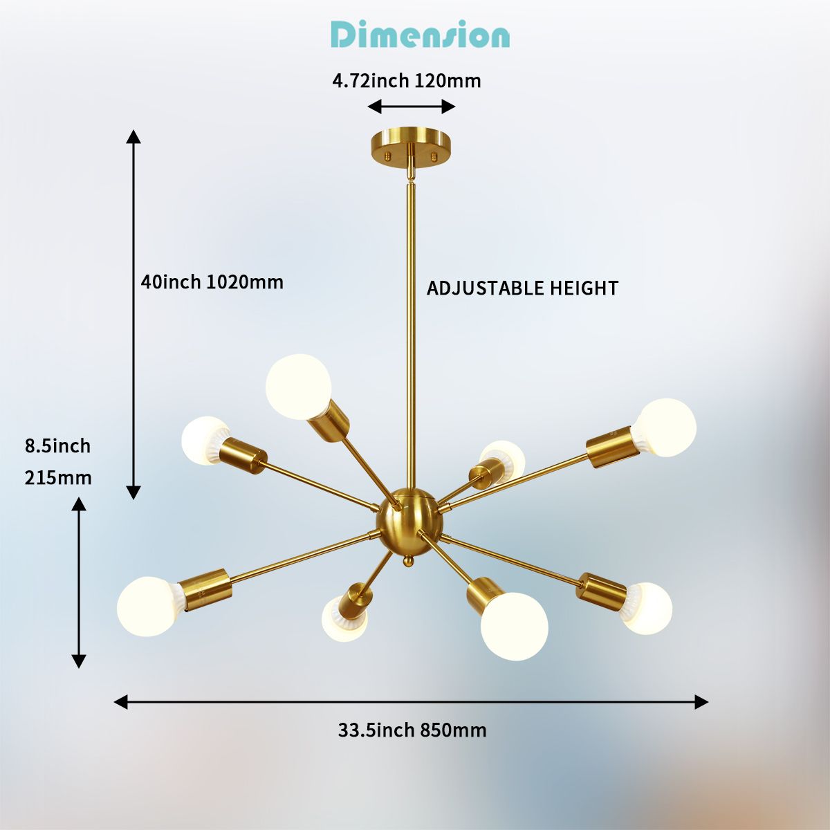 The 8-light Sputnik chandelier is made of high-quality metal material, and the brushed brass color makes it look elegant and simple. Brighten up your home with its modern and eye-catching design, giving you a cozy feeling. You can install it in dining room, living room, bar, kitchen, attic, coffee shop and other places that need decoration